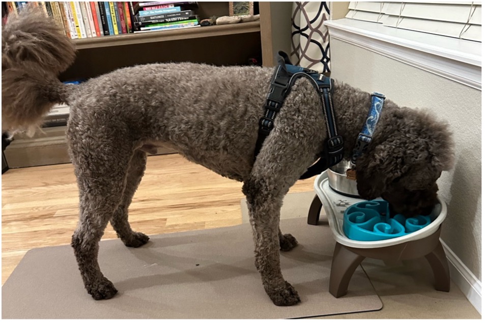 Raising the bowl to the level that allows a neutral spine and minimal neck flexion will shift weight back on the pelvic limbs, which is actually a good form of exercise for dogs with pelvic limb OA (isometric strengthening). The ideal level of the food bowl is typically at about the dog’s shoulders. There are many commercially available elevated feeders such as this.
