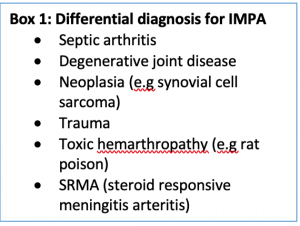 Complete workup is intended to identify definitive etiology and if none is found idiopathic IMPA is the presumptive diagnosis. Importantly septic arthritis must be ruled out before immunosuppressive therapy is instituted.