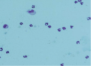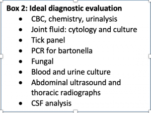 This extensive workup can be helpful in excluding many etiologies. That said, from a practical perspective, cytologic evaluation of joint fluid can confirm IMPA allowing for empirical treatment when a full workup is not possible; arthrocentesis of 3 joints is recommended. Normal joint fluid should have less than 3000 WBC/ ml and rare RBCs. Mononuclear cells make up 90% of the WBCs. Inflamed joints will have higher WBC counts and greater than 10% neutrophils. An easy method of screening in clinic is to count the number of cells per high-powered field and multiply by 1000. Septic joints will have large numbers of degenerative neutrophils and you will often see bacteria extra or intracellularly. When seeking etiology pooled culture is sufficient and the use of broth enriched media ( e.g. blood culture bottles) increases success in culturing.