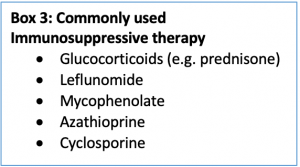 Treatment of IMPA is based on the underlying cause if identified. Additional therapy must address pain. The cornerstone of idiopathic IMPA therapy is immunosuppressive medication and, in general, prognosis is good although relapse can occur. Glucocorticoids (once bacterial etiology is ruled out) are typically first-line therapy followed by the addition of or transition to other immunosuppressive agents ( Box 3). For patients with mild and transient polyarthritis, NSAIDs may be sufficient, but should not be given concurrently with glucocorticoids.